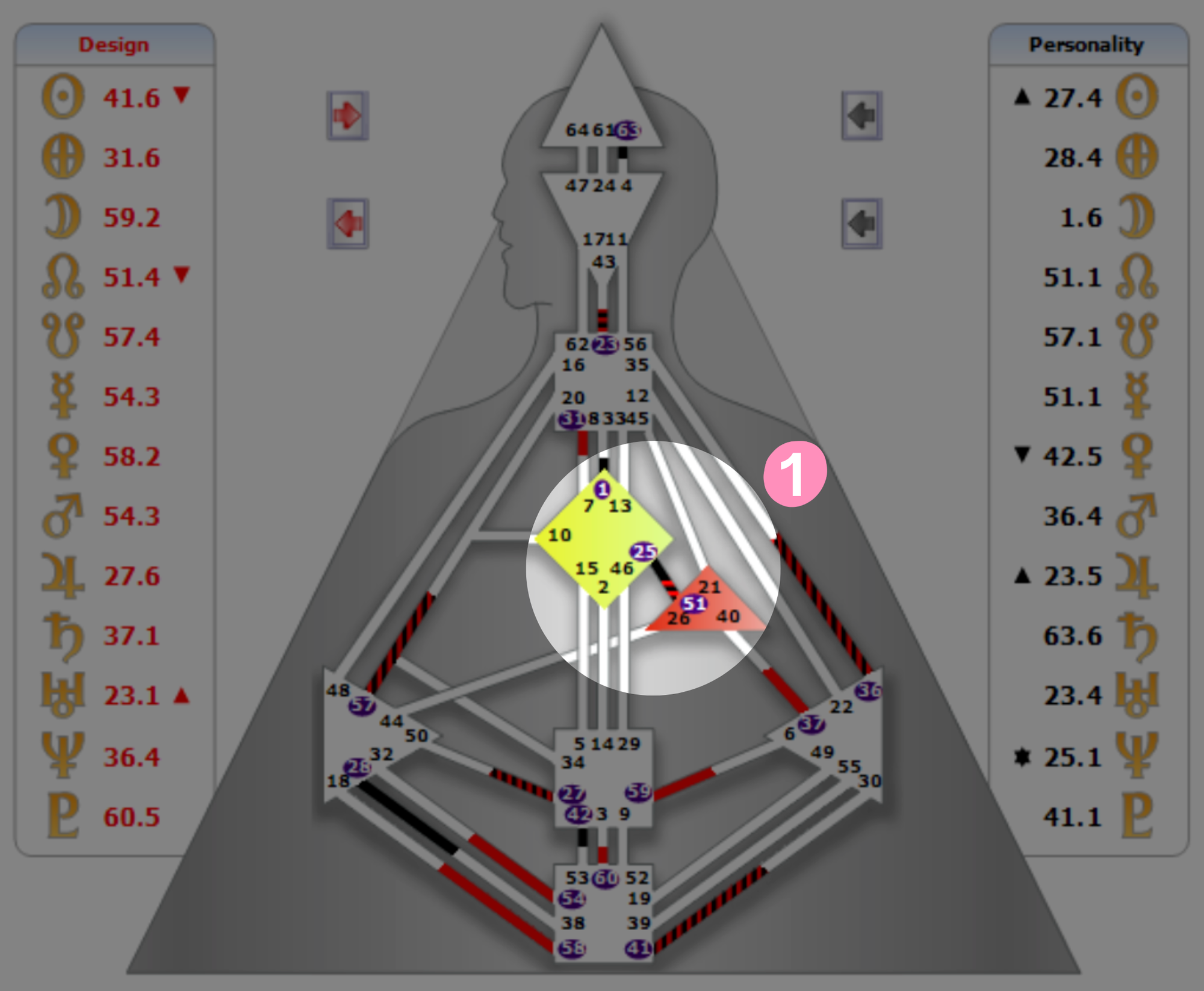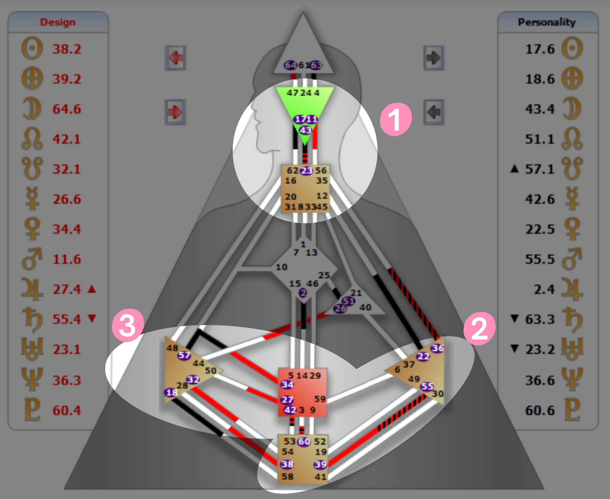 所以你經常會看到文章寫著:有定義的能量中心、有定義的通道、有定義的閘門,這些都是指某個能量中心有被塗上顏色、有完整的線、有被圈起來的數字,如下圖: