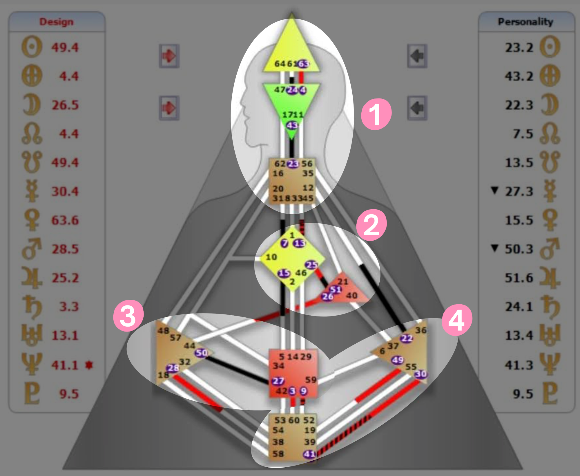 內在有定義的能量中心被分成四個區塊,四個區塊都沒有連接在一起。四分人最少會有 8 個能量中心,最多是9個能量中心都有定義。