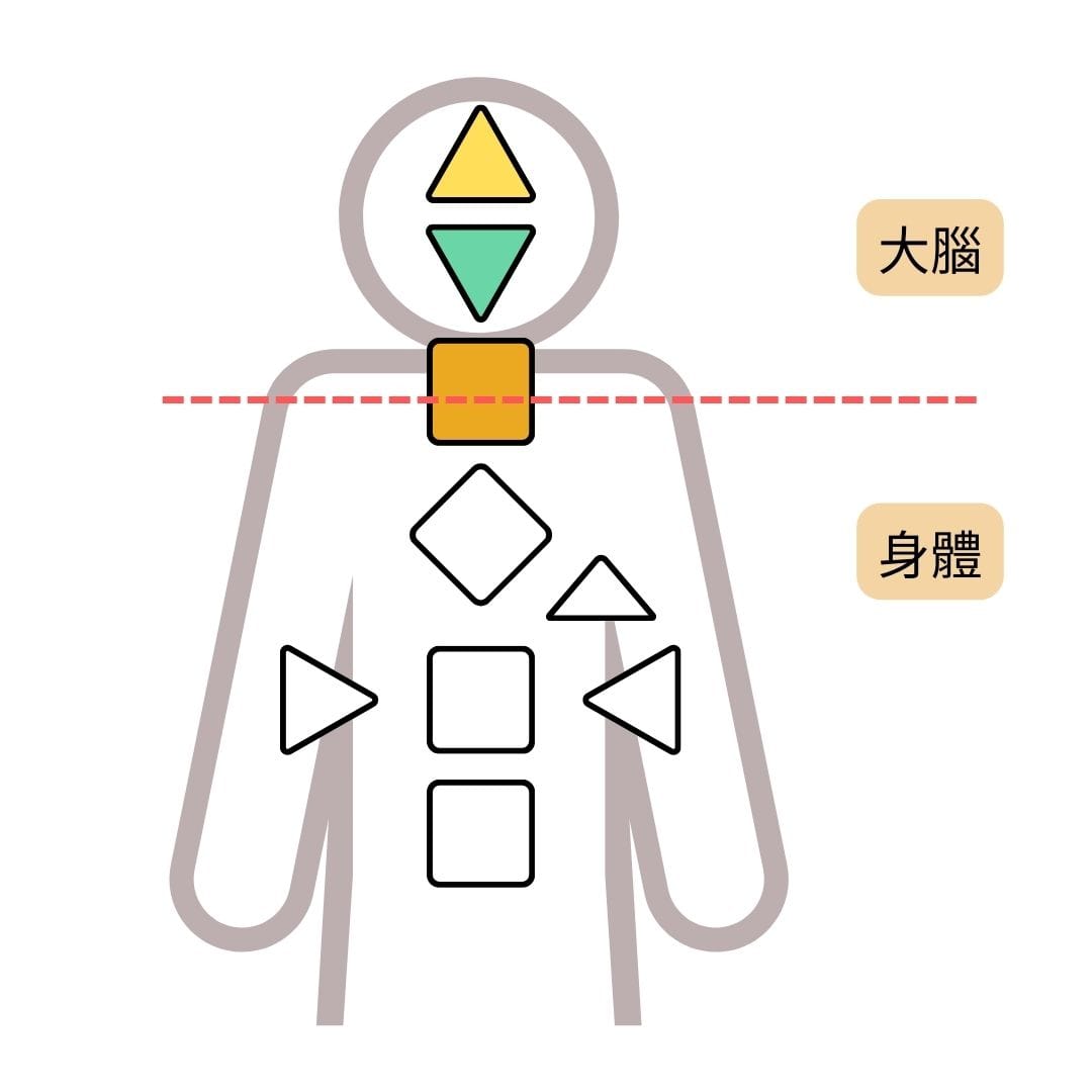 但喉嚨以上的能量中心位於大腦,大腦的知識與價值觀是經由教育、社會被訓練而成,也因此,大腦在說的都是「和別人比較」、「如何符合社會價值觀」。很多時候,因為大腦中的想法非常強烈,大家也容易忽略身體來的訊息,以及內在的渴望;這也是「回到內在權威與策略」這句話的基礎,回到身體的覺察,而非大腦的想法。